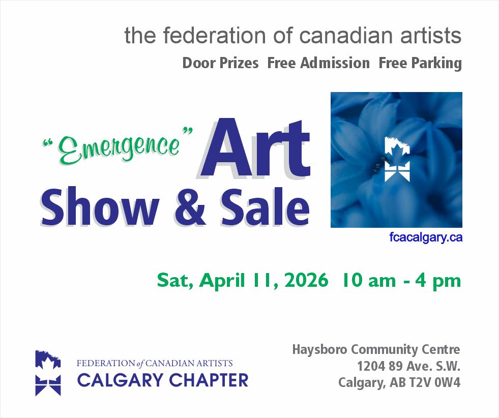 The Calgary Chapter of the Federation of Canadian Artists provide our members and wider community many activities and events throughout the year. We organize several shows and a long list of workshops annually. We invite you to participate with us in everything that we have to offer. You can contact us to ask any questions you have about what we are doing at the bottom of the page. Calgary Chapter Members are excited to present the following events: